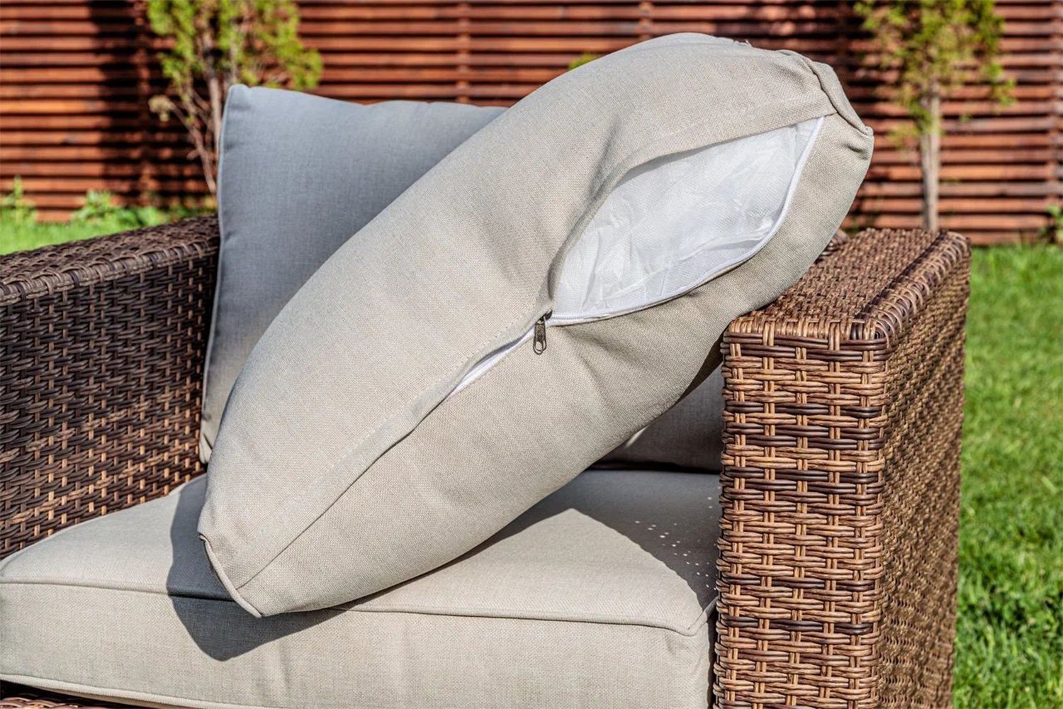 Комфортные места для сидения на природе – залог успешного отдыха. С помощью комплекта уличной мебели Karl коричневого цвета удастся создать лаундж-зону повышенного комфорта, ведь комплект состоит из трехместного дивана, двух кресел и низкого столика, который не будет перекрывать вид на собеседников, но сможет разместить на себе чашки с напитками. Особый комфорт от мебели удается добиться с помощью мягких элементов.