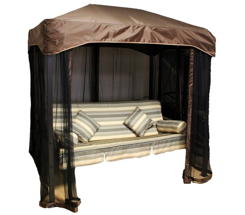 Мы хотим предложить вам приобрести комплект, предназначенный для четырёхместных качелей-шатра Монреаль. Данный комплект выполнен в коричневом цвете, он состоит из тента-крыши и противомоскитной сетки. Предназначен данный комплект для качелей, ширина которых составляет 160 см, длина 235 см, высота 220 см. Изготовлен тент из такого материала, как синтепон.